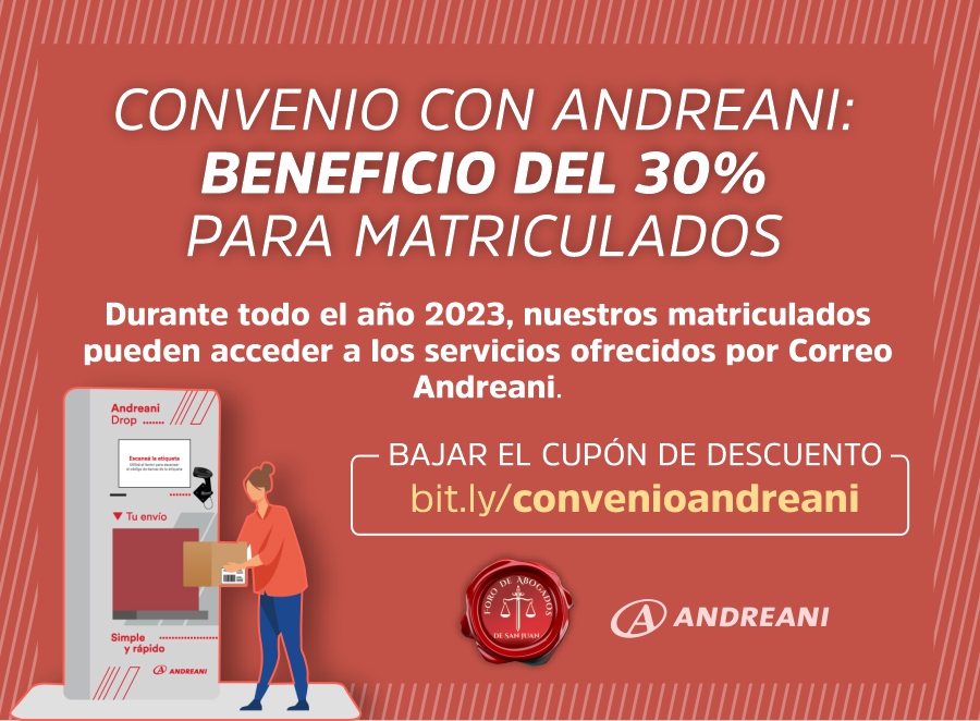 El objeto del convenio tiene una finalidad colaborativa y además beneficia a los matriculados con un 30% de descuento en todos los servicios ofrecidos por Correo Andreani y son válidos exclusivamente mediante el uso en la plataforma www.andreani.com, las bases y condiciones de esta promoción que no es acumulable ni combinable con otros beneficios, se encuentran en dicha página.