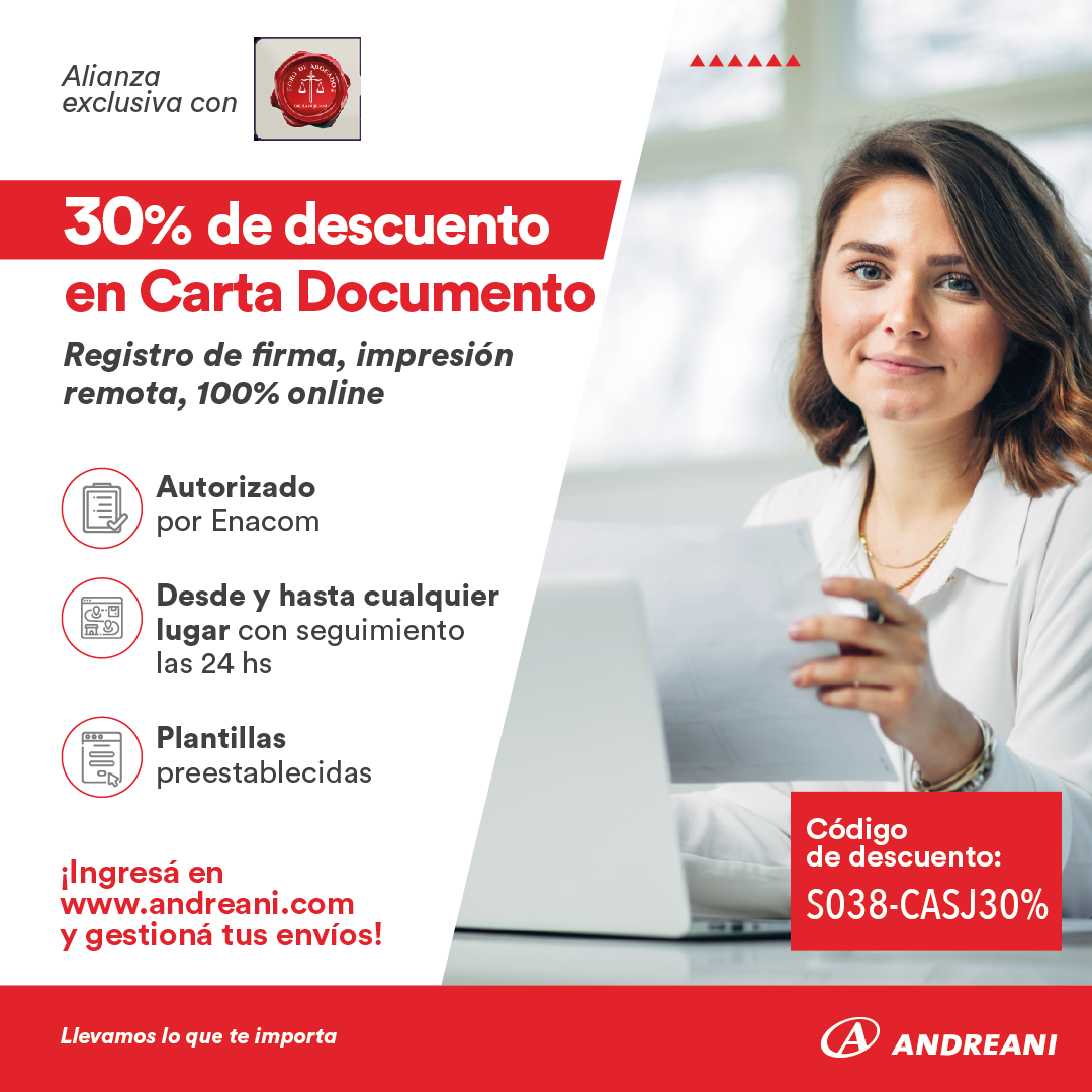 NOTA: Dicho cupón no sólo puede utilizarse para obtener el descuento en el envío de cartas documento, sino también para cualquier tipo de encomienda que se gestione por medio de Andreani Online.