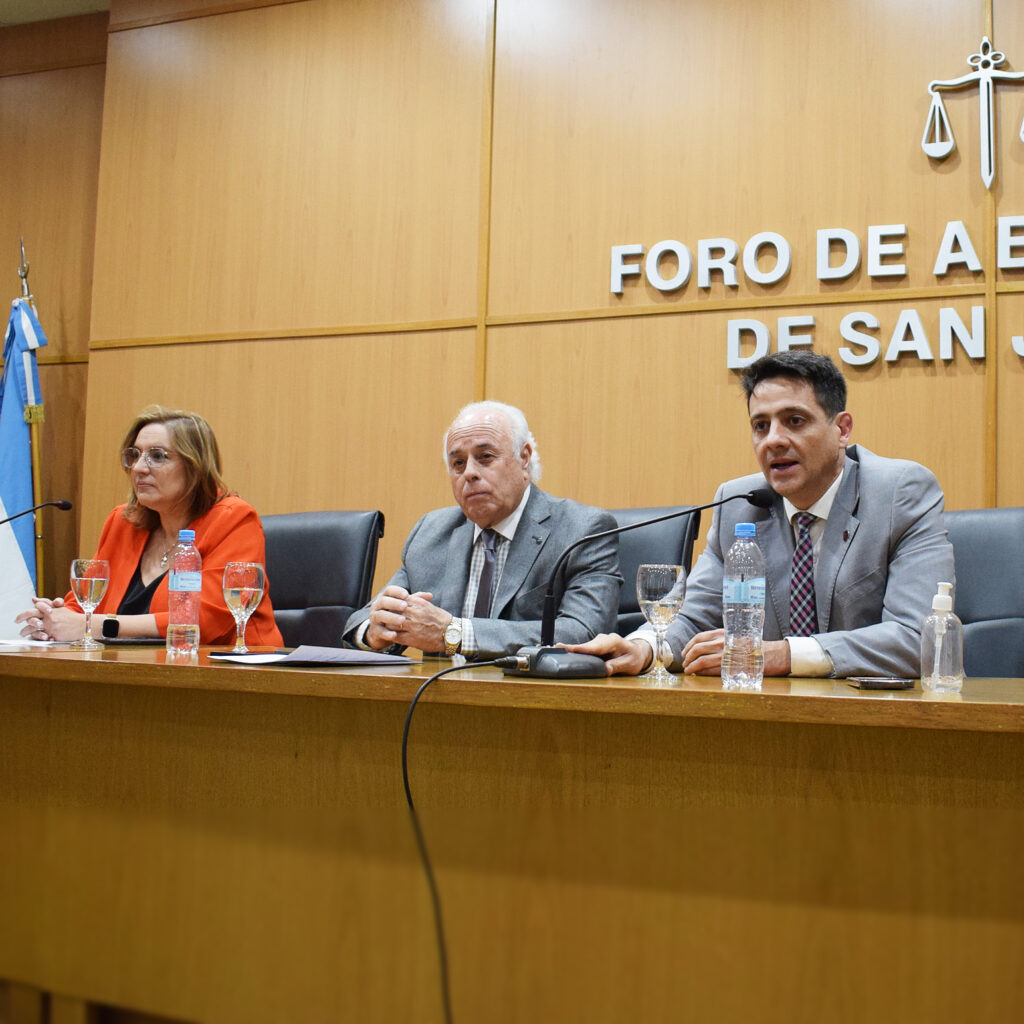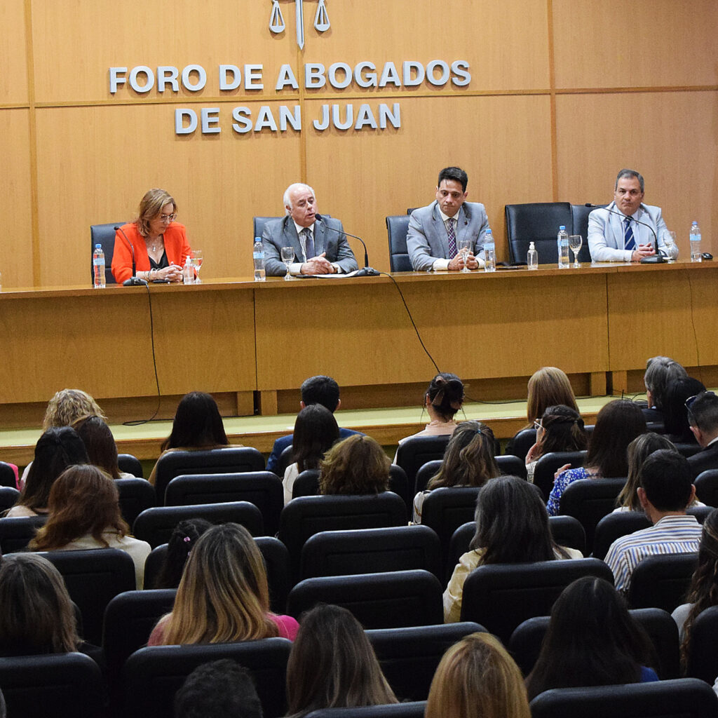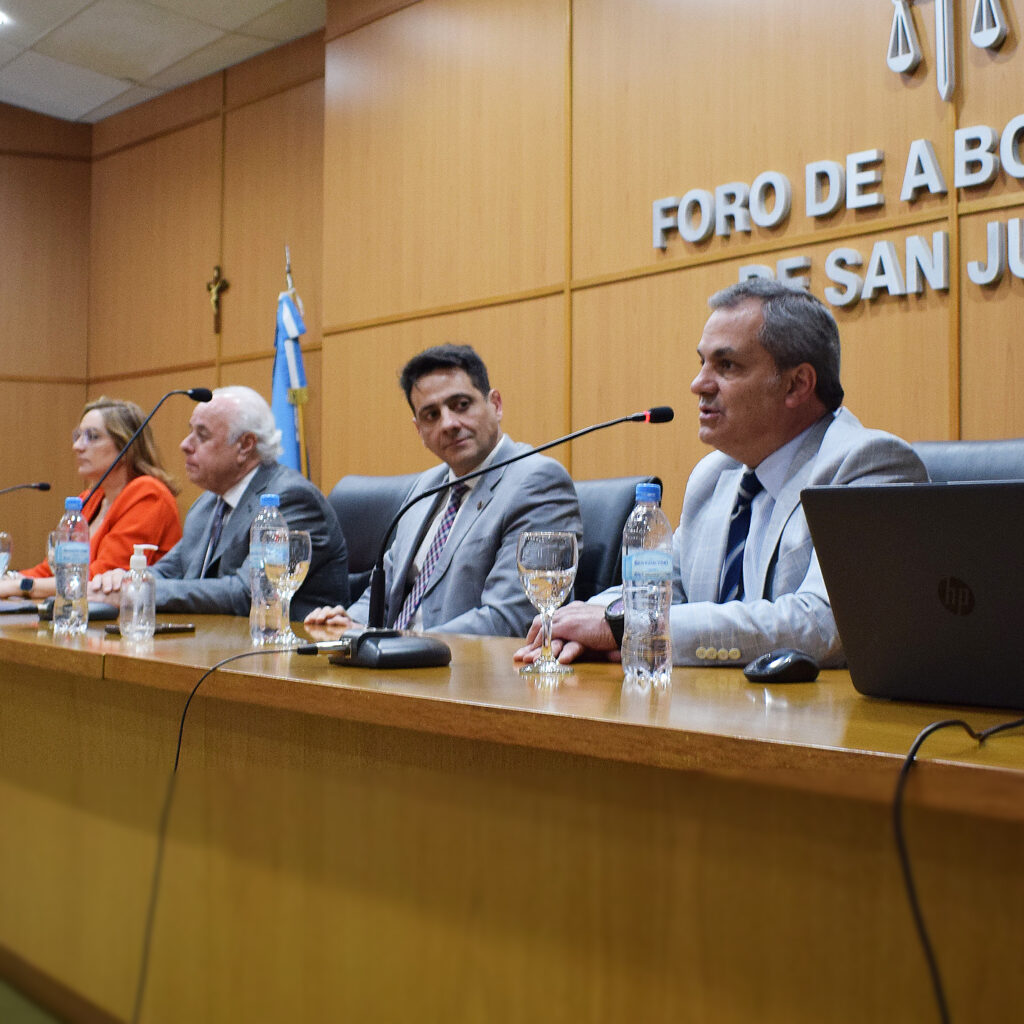 La mesa de autoridades estuvo integrada por el Ministro de la Corte de Justicia de San Juan, Dr. Marcelo Jorge Lima, la Representante de la Escuela Judicial, Dra. Adriana García Nieto; el Presidente del Foro de Abogados, Dr. Franco Montes y el Vice-presidente del Colegio de Magistrados y Funcionarios del Poder Judicial de San Juan, Dr. Carlos Fernández Collado.