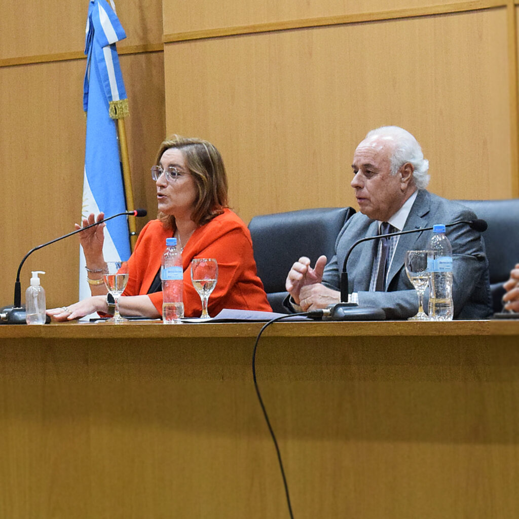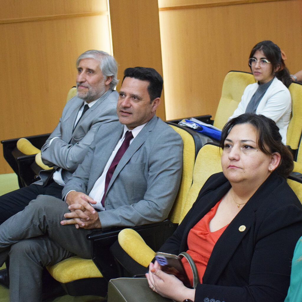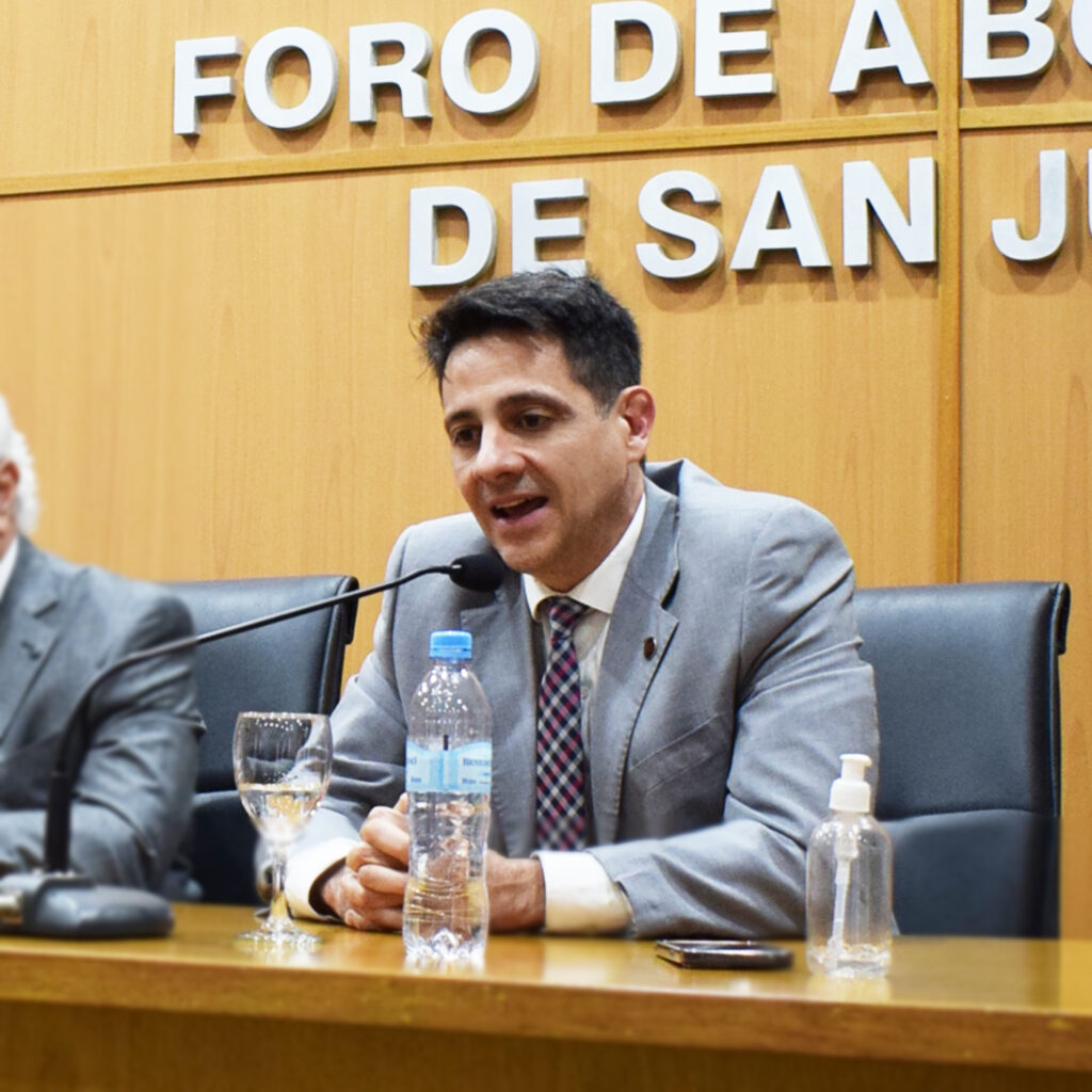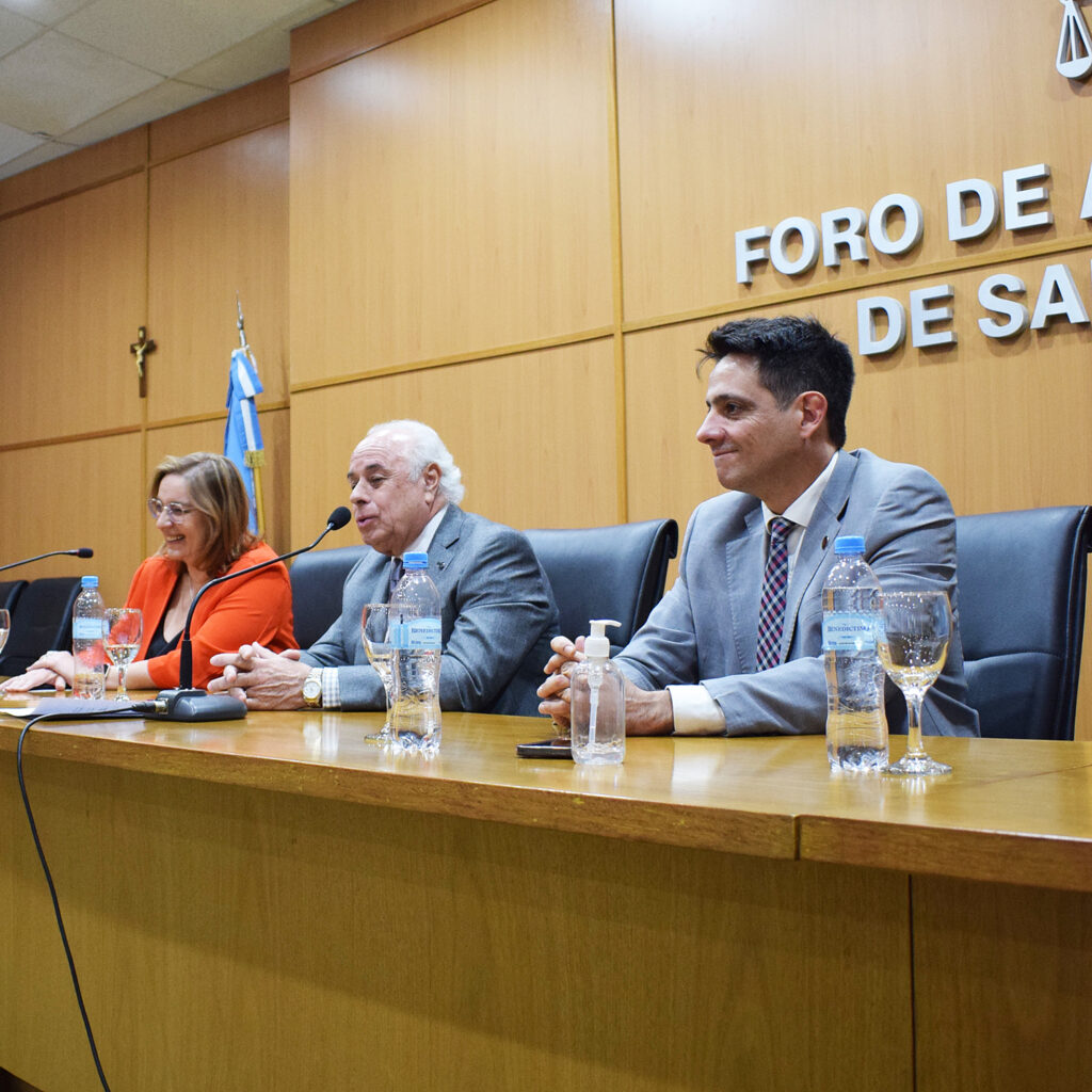 La mesa de autoridades estuvo integrada por el Ministro de la Corte de Justicia de San Juan, Dr. Marcelo Jorge Lima, la Representante de la Escuela Judicial, Dra. Adriana García Nieto; el Presidente del Foro de Abogados, Dr. Franco Montes y el Vice-presidente del Colegio de Magistrados y Funcionarios del Poder Judicial de San Juan, Dr. Carlos Fernández Collado.
