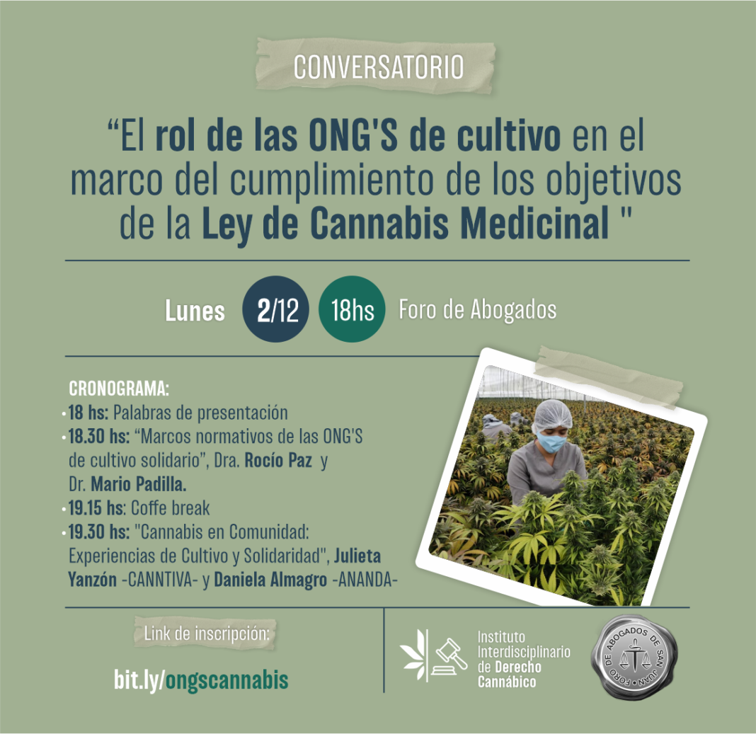 “El rol de las ONG’S de cultivo en el marco del cumplimiento de los objetivos de la Ley de Cannabis Medicinal” 29 noviembre, 2024 53 LINK DE INSCRIPCIÓN: https://bit.ly/ongscannabis