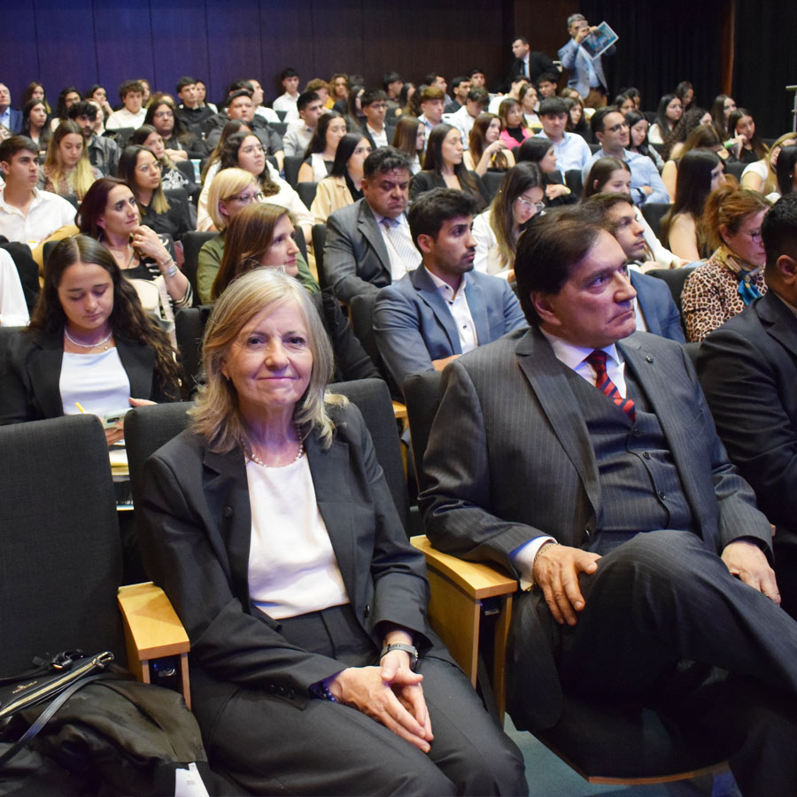La mesa académica de apertura estuvo conformada por el Presidente del Foro de Abogados, Dr. Franco Montes, el Ministro de la Corte de Justicia, Dr. Daniel Olivares Yapur, el Decano de la Facultad de Derecho y Ciencias Sociales, Mag. José Luis López Cerviño, y el Codirector del Instituto del Novel Abogado, Dr. Mathias Saavedra. En la jornada también estuvo presente la Sra. Vicepresidente del Foro de Abogados, Dra. Carina García Bueno.