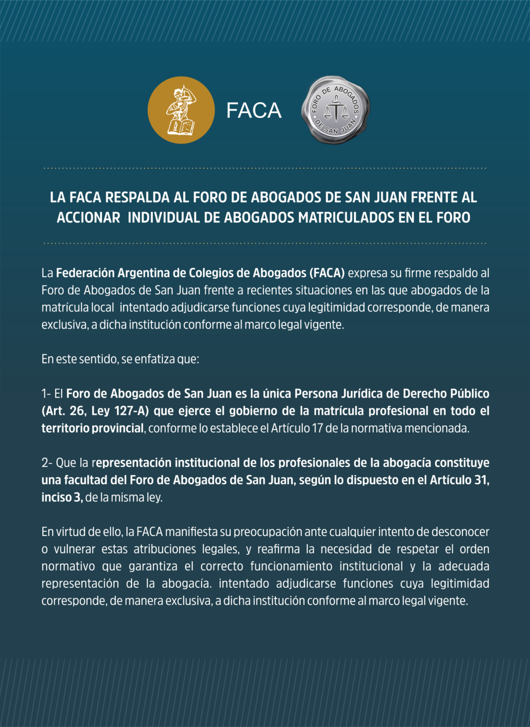 LA FACA RESPALDA AL FORO DE ABOGADOS DE SAN JUAN FRENTE AL ACCIONAR INDIVIDUAL DE ABOGADOS MATRICULADOS EN EL FORO